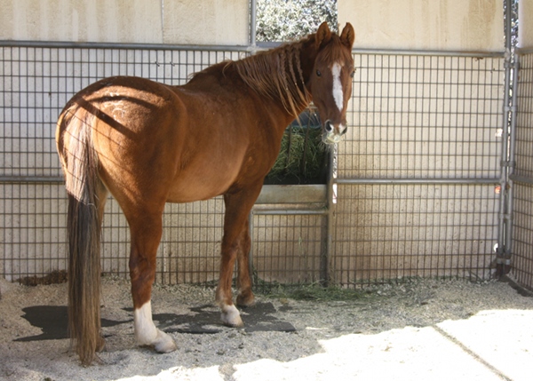 When I brought Gunsmoke home, he gained weight fairly rapidly, even though he and Prim shared a 24’ x 24’ pipe corral. Prim was clearly the boss, and would drive him away from “her” hay with her ears flat and her teeth bared. Gunsmoke and the mare he had been stabled with (both by the same sire) belonged to a man who didn’t live on the property, and apparently didn’t notice their skeletons were protruding so obviously under their skin he could have hung clothes on them. It took me about a year of owning Gunsmoke to realize that while he was in much better health—he was even growing a mane—Prim was losing weight. She wasn’t accustomed to having a stable mate. Gunner was, and as soon as he finished his hay, he ate hers. If she wasn’t interested in eating at the moment, she would let him.